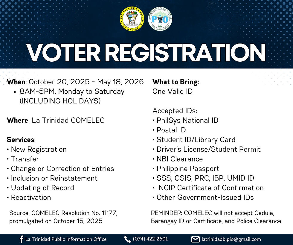 For inquiries, kindly message La Trinidad COMELEC (https://www.facebook.com/LaTrinidadComelec).