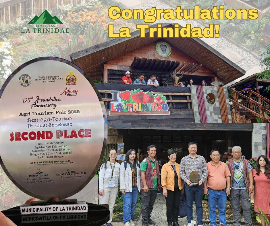 Congratulations, Team La Trinidad, for yet another win! With only a difference of .13 from the 1st placer, the La Trinidad Agritourism booth wins Second place in the Adivay Agri Tourism Fair highlight! The award was received by Coun. Belmer Elis, and Mun. Agriculturist Ms. Nida Organo. Kudos to the whole team spearheaded by the Office of the Municipal Agriculturist (OMAG).❤️ #limitlesslatrinidad
